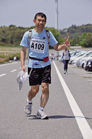 朝6時(87キロ地点)に朝食をとり油谷中学校で着替えをして,さあこれから仕切り直しだ。朝食は中華丼だったが中華味のするおかゆのようなもので,そんなにお腹にもたれない。足も快適,眠気もない。夜一夜(よっぴて)走ってきたが,今日もひねもす日本海を臨む海岸線を走り続けよう。油谷島を一周して,川尻岬,立石観音を経て長い坂道を登り千畳敷に正午に着く。ここは125キロ地点でちょうど250キロの半分だ。足はまだ大丈夫,快調快調(写真@)。だが,千畳敷の下り坂はかなり急でここを走り降りるのはかなり足首に負担がかかる。出来るだけ膝をやわらかく使って慎重に下る。国道191号線に出て,さらに仙崎公園から鯨墓(くじらばか)を目指す。このとき,この191号線沿いの歩道でクリーム色に近い“白い蛇”に遭遇した。このまま日本海沿いに島根県まで行けば神話の国八雲立つ出雲に着く。この90p程度の小さい白蛇も出雲大社の八岐大蛇(ヤマタノオロチ)の遠い子孫であろうか。小生を励ますためにわざわざ目の前に現れてくれたのであろうか。これは吉兆。きっと山口市の瑠璃寺まで完踏できるぞ,好事だと喜んだ。浮き浮きした気分で,鯨墓のチェックポイントを過ぎ,次なる宗頭文化センターに向かった。もうすぐ大会二日目の日が暮れるため,宗頭文化センターで仮眠をとるかそれとも一気に萩を目指すか考えながら,ゆっくりと走っている時だった。右足の外側のくるぶしから底部にかけて,激しい痛みを感じた。疲労による腱鞘炎かあるいは骨にヒビが入ったか,回復不可能なイヤな予感のする痛みだ。昨夜眠気のあまりに転倒した時の右足打撲が遠因か,そしてあの千畳敷の急勾配の下りでさらに悪化したのか。とにかく,なお数キロ歩くも痛みは消えず,このまま強行すれば今後の競技人生に多大な影響が出るのは必至。大好きなサッカーも出来なくなってしまう。でも,明日の制限時刻までにまだ23時間もある。残り80キロをゆっくり歩いても完踏することはできるかも知れない。宗頭文化センターに到着する直前まで,続行するか棄権するか迷っていた。最もつらい選択をしなければならない時が迫ってきた。宗頭文化センターに待機する係員に告げた,「ゼッケン109番森山,棄権します」と。自分のマラソン人生の中で生まれて初めての棄権である。吉兆だ!好事だ!と特別な意識をもってしまったが,自分の座右の銘,すなわち,『好事不如無(碧巌録)・無事是貴人(臨済録)』をすっかり失念していた。