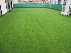 芝生を育てる環境としての好条件は日当たりが良いこと,水はけが良いことです。通常屋上は日光を遮る物が何も無いので文句なしです。水はけに関しては,屋上そのものが雨水が排水口に向かって流れるように設計されているため,排水口が詰まっていない限り如何なる豪雨でも芝生に水溜りができることは有り得ません。ゴルフ場のグリーンでさえ大雨の時は水溜まりができますので,そういう意味では屋上は芝生を育てる絶好の環境と言えます。その他,地上ではモグラや犬猫の糞尿被害もあると聞きますが,屋上ではそのような心配も御無用です。