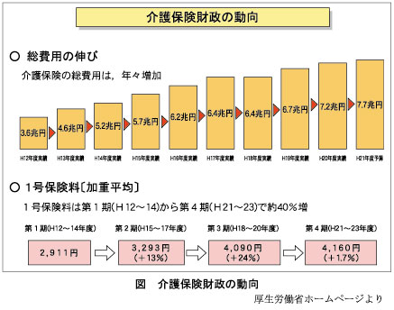 介護保険の財源は,国25%,都道府県12.5%,市町村12.5%,1号被保険者・2号被保険者50%となっていますが,介護費用の増加(図「総費用の伸び」を参照)により年々被保険者の保険料も上昇し,第1号被保険者の保険料は全国平均で第1期の2,911円から第4期には4,160円になっています(図「1号保険料」を参照)。ちなみに,鹿児島県で一番保険料が高いのは奄美市で5,100円,一番低いのは三島村で2,750円です。