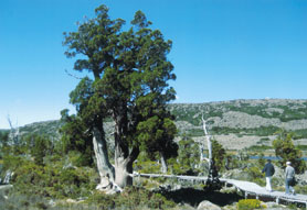 午前ボードウォークで南極ブナ,スノウガムやブッシュペッパーなどの植物を観賞,ついでダブ湖周辺のハイキング。氷河岩,ボート小屋などを経て標高980m地点のビューポイントまで歩いた。生憎の曇りでクレイドル山の一部は雲に覆われていたが,それでも独特の荒々しい岩肌の威容に圧倒された(写真 7)。山の形は丁度阿蘇山群の根子岳に似ている。午後キングビリーパイントラックへ,樹齢1,500年のキングビリーパインを見上げた(写真 8)。