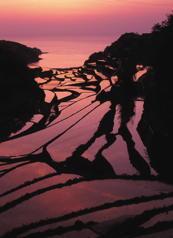 佐賀県玄海町の浜野浦海岸に流れ込む浜野浦川によって形成された浸食谷に,狭い土地を有効に使おうと先人たちの知恵がこのような造形を作り出したものと思われます。日本の原風景の一つと言われます。例年,4月中旬から田んぼの水張りが始まり,5月上旬には田植えが終わります。この間,玄界灘に沈む夕日によってオレンジ色に染められた海面と水田が逆光の中の黒い畦道の幾何学模様との対比で素晴らしい光景をみせてくれます。この場所は全国的に棚田の撮影スポットとして有名な場所で,全国からカメラマンが撮影に来るようです。小生も二度ほど行きましたが気象の面で恵まれたのは一回でした。それは2004年5月5日でした。まさに前述したような光景に出合い感激の一瞬をフィルムに収めることができました。最近いずれの棚田も高齢化に伴い耕作者が減少して荒れ地になりつつあるやに聞いております。棚田を持つ各地ではオーナー制度等様々な形で棚田の保全に努めておられるようです。棚田を保全するということは環境問題とも大いに関連があります。この風景が何時までも後世に受け継がれていくよう願わずにはおられません。