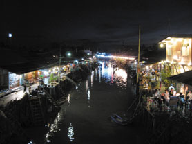 宿のおやじお薦めのナイトマーケットも覘いてみた。メークロンはあまり大きな町ではないので,市内バス路線が発達しておらず,その代わりに「ソンテウ」というトラックの荷台を座席に改造した乗り物が住民の移動に一役買っている。おそらく時刻表などは無く,客をある程度乗せ採算が合うまで出発しないという,アジア的頑固さに基づいた交通機関である。ただ,路線上であればどこで乗り降りしても良いというアジア的融通の良さも併せ持っている。ドナドナよろしく祐里ちゃんと荷台で揺られ,川沿いの市場に着いた時,その幻想的な美しさに目を奪われた。川の両岸には多くの店が並んでおり,軒先にたくさんの裸電球をぶら下げている(写真 2)。その柔らかい光に映し出される川面を行き来する何艘もの手漕ぎボート。ボートの上には商品が積まれ,行き交う舟同士あるいは岸で待つ客と商売をするのだ。舟が浮いていない水面には裸電球の光がキラキラと反射し,上下から優しい光で包まれた周りの風景は淡い思い出の中の一コマの様な,非現実感を感じさせる程だった。焼き鳥を頬張り,タイビールを片手に祐里ちゃんと川の景色を眺めながら他愛もない話をする。ボートに乗ってホタルも見に行った。点滅するタイミングが早過ぎて,日本のホタルの様な趣は無かったが,その数の多さでまあなかなかの見物であった。何より祐里ちゃんが喜んでいたので良しとしよう。