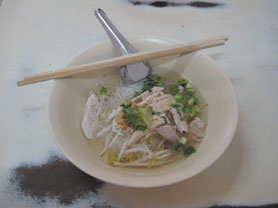 朝は窓から差し込む陽光で目が覚めた。2人で市場へ朝食を食べに行く。私は鶏肉の入った米の麺をいただいた(写真 3)。スープに麺と香草,鶏肉が入っただけのシンプルな1品だが,あっさりとした塩味のスープが朝食に適している。25バーツ(約75円)。