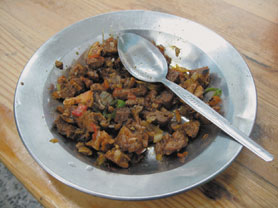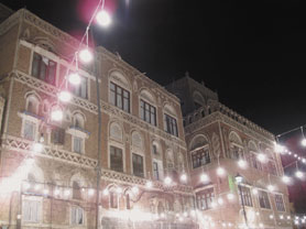 イエメン滞在の数日間は瞬く間に過ぎていった。旧市街を心ゆくまで散策し,マーシーのサヌア近郊ツアーに参加し,現在のイエメンを垣間見ようと新市街にも足を延ばした。カートを噛みながらマーシーと色んな話をした。結婚式の宴も見物した。チキンの丸焼きや駱駝の焼き肉,魚の丸焼き,マーシーのサヌア近郊ツアーで寄ったホテルでは,客人をもてなす為の立派なイエメン伝統料理の数々を口にした(写真 1)。果物をその場で搾ってくれる生ジュースや,練乳がたっぷり入ったこってり甘いチャイを飲んだ。多くのアラブの男達の親切に触れた。ホテルの屋上から夕日に染まった「幸福のアラビア」の末裔たるサヌアの旧市街を飽かず眺めた・・・(写真 2)。