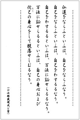 普勧坐禅儀の中に「坐禅は習禅にあらず,只これ安楽の法門なり。菩提(仏道とも衆生本来成仏とも悟りともいう)を究尽するの修証なり。公案現成,羅籠いまだ到らず,もしこの意を得ば,竜の水を得るが如く,虎の山に靠よるに似たり。まさに知るべし,正法自ら現前して,昏散まず撲落することを。」とあります。