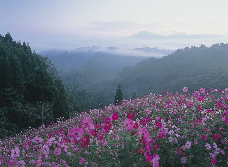 秋の初めになりますとコスモスの便りがあちこちから聞こえて来ます。かつて南小国町にコスモス村がありました。この場所に14〜5数年前からコスモスが植えられておりました。ここは杉木立の間のコスモスと,高原特有の気象がコスモス園の向こうに雲海を見せてくれます(運がよければの話です)。このように杉木立や霧,雲海がコスモスを引き立ててくれる良い脇役を果たしてくれていました。このようなロケーションが写真愛好家を引きつけていたのでしょう。ところが広大な土地の管理と花の管理には相当な経費を要し,コスモスの時期だけの収入では維持が困難となり,3年ほど前に閉園されたそうです。小生も3回ほど通いました。前日の夜に車を走らせ駐車場で車中泊をし,夜が明けるのを待って撮影に入ったものでした。
