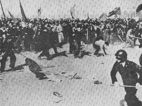 若い人々はそれぞれの立場で敗戦の虚脱から這い上がろうとしていた。その頃日本全国まったく重苦しい事件に満ちていた。下山事件・三鷹事件・松戸事件(昭和24年・1949),安保条約(昭和26年・1951),日本の防衛のため警察予備隊・自衛隊と段々規模が太り始めてついに朝鮮戦争(昭和25年・1950)にまで拡大してきた。それに対して学生および労働者側は再軍備反対,安保条約改定反対の大規模なデモを繰り返していた。労働者の団体を含めて血のメーデー(写真1)もその頃である。私が通っていた日比谷公園のCIE図書館は近くには宮城前広場もあるし,マッカーサーのGHQ(連合国最高司令官総司令部)も近かったので周囲の警戒は厳しかった。デモ隊の周りを騎馬警察隊が取り囲んで,デモ隊のシュプレヒコールや怒声などで双方なかなか険悪な雰囲気だった。