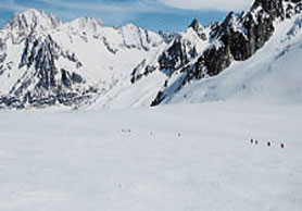 シャモニーでは“クラブメッド(後述)”に宿泊して優雅なスキーリゾートスタイルを満喫。ここでは氷河スキーを生まれて初めて体験しました!!山頂に着いたらまずガイドと命綱をつけて,数百メートル山の峰を歩きます。右に落ちても左に落ちても命を落とす横幅たった数メートルの峰を歩いて氷河に辿り着いたら,広大な氷の上を果てしなく果てしなく1日かけて滑り降ります。「カリカリッ」と音を立てて滑る氷河スキー(写真4)。氷の裂け目(クレバス)を避けながら,時々ガイドが立ち止まっては真っ青なクレバスの中を覗かせます。巨大なクレバスに落ちれば間違いなく命を落とすそうですが,ガイドの後を付いて延々と氷の上を滑る氷河スキーは格別なスキーのひとつです。