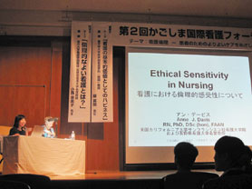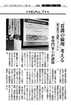 「無医島に駐在する看護師の看護継続教育支援システムの開発」について,学内研究者グループとデービス博士とともに対象者の選定,研究方法論について討議を行い,助言をいただいた。また,ルーラルナーシングの専門家であるカナダのサスカチュワン大学看護学部教授のNorma J. Stewart博士ともメールを活用し現状について意見交換を行った。 デービス博士の研究経験に基づく知見の奥深さと広がりのある助言は,今回の研究課題においても活かされ,これにより,他文化の視座から日本の伝統的慣習と倫理的価値について改めて見直し,視野を広げる結果となった。デービス博士滞在中には実際の調査は行うことができなかったが,住民がどのようなニーズを持っているかに焦点を当てた調査方法や,住民の倫理的側面への配慮について助言をいただき,今後の調査・研究につながるものとなった。 また,他の看護教員,大学院生,国費留学研究生においては,それぞれの研究課題についてデービス博士と意見交換を行った。各教員,大学院生,研究生は,この過程でそれぞれの研究に対し,デービス博士の豊富な研究蓄積を踏まえた具体的な助言・指導を受け,研究デザインの選定や結果の解釈を行う上で大きな知見を得,研究を遂行する上で役立つものとなった。 2.国際フォーラムでの講演 平成23年10月22日に,鹿児島県内外の看護職者・医療者を対象に,鹿児島大学医学部鶴陵会館にて第2回かごしま国際看護フォーラム「看護倫理−患者のためのよりよいケアをめざして−」を鹿児島大学病院との共催で開催した。日本においては,倫理への関心は最近急速に高まっているが,看護師の多くは,倫理とは何か?何故重要か?倫理的に考えるとはどういうことか?などの理解がまだ十分とはいえず,看護専門職としての倫理の理解が曖昧であるのが現状である。その点を踏まえ,デービス博士には「倫理的感受性をどう高めるか」をテーマに講演していただいた(写真1,2)。講演の後,日常的な看護業務の中で避けて通ることのできない看護や医療の倫理的課題をめぐって,会場から様々な質問や意見が出され,活発な討論が行われた(写真3)。 フォーラムには,医療施設で実務に従事している看護職,看護師養成機関の教員,看護学生など,県内はもとより,遠くは長野,東京などから約230人の参加があった。また,倫理問題への関心の高さからか,南日本新聞社の取材もあり報道された(図1)。詳細は,本学ホームページにも掲載されている。 http://www.kagoshima-u.ac.jp/topics/2011/11/post-154.html 3.学部および大学院教育の支援 「看護倫理」,「看護教育学」,「看護学原論」,「小児看護学概論」の科目において,授業の一部をデービス博士に担当してもらった。また,大学院生と教員を対象とした国際セミナーを2回開催し,講演をお願いした。授業は学内外の教員・研究者・大学院生にも公開した。教員は,知識の学びに加え,教育の手法や戦略,学生との対話のあり方等について多くの示唆を得る機会となった。また学生は,教授された内容から多くの知見を得ることはもとより,英語で授業を受けることにより,海外に目と耳を開く機会にもなった。さらに,海外の状況を知ることにより,日本の看護実践や教育についても考察が深まり,大変よい経験になったと考える。国際セミナーの詳細は,本学ホームページに掲載されている。 1ヵ月という短期間であったが,デービス博士にはフルに講義・講演・指導と大きく貢献していただいた。たくさんの教員,学生がデービス博士の部屋を訪れ,研究指導・助言をいただいた。中には,実習場で実際に経験した倫理的ジレンマを打ち明ける学生もおり,涙ながらに自分の経験を話し,デービス博士に助言をもらうことで,1年間思い悩んでいた問題が解決したと喜んでいた。地域看護職を対象としたフォーラムにおいては,活発な意見交換がなされ,鹿児島の地で国際フォーラムを開催したことに対する感謝のメールも学外から何通か受け取った。 デービス博士の実質的な活動は,鹿児島の看護に多大な貢献をもたらしたと考える。平成24年の3月には学内研究グループと若手教員数人がカリフォリニア大学サンフランシスコ校を訪問し,研究打ち合わせを行うとともに,学生交流についても検討する予定である。是非今後もデービス博士および大学間の交流を続けていきたいと考えている。