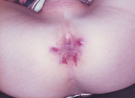 赤ちゃんの痔瘻は私の一番興味を持つ病気だ。判らない点が非常に多い。まず男児のみで女児には絶対に見られない。また,2〜3週間ぐらいで必ず左右対称にできる。大人と違って複雑痔瘻までに進行しない。これらの原因についてはホルモン説,遺伝説,男女の肉体構造説など色々あっていまだに定説がない。不思議な病気だ。