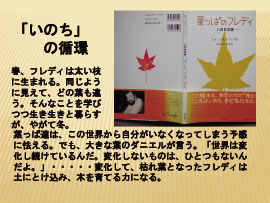 最後に,「葉っぱのフレディ」(レオ・バスカーリア作)の話の中で,大きな葉っぱのダニエルがフレディに言う「死んで終わりなのではない,いのちは他のいのちを生かし続けながら,永遠に循環している,それが<いのち>である」と言う言葉で,話を締めくくられました。
