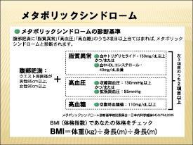 スライドに,メタボリックシンドロームの診断基準と,肥満の判定基準を示しましたが,不適切な食生活,運動不足,ストレス過剰,喫煙,飲酒など生活習慣の改善に取り組みたいものです。