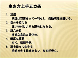 と同時に,頭を使って生きるという心掛けを忘れてはなりません。脳細胞を働かせ続けると認知症にはなりませんし,たとえ始まっていても進行を抑えることができます。頭を使うということ,何事にでも好奇心を持つ,新聞をしっかり読む,本を読み,手紙を書く,持続できる趣味を持つ等,前向きな意欲を失わないように生きたいものです。