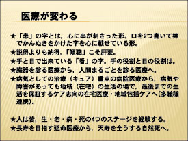 「患」という字の形を見てみましょう。心に串が刺さった形なのです。ということは,医療者の仕事は,その刺さった串を取り除くことなのです。更にいえば,口を2つ書いて棒でかんぬきを懸けた字を心に載せている形が患という字なのです。医師と患者とのコミュニケーションの難しさを示唆しています。
