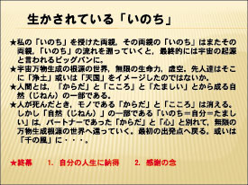 何か絶対的なものに生かされて生きている自分,私にはそんな実感があります。私なりの死生観を簡明にスライドに整理してみました。