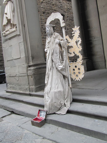 キリスト像のパフォーマー,足許にはお賽銭箱?(左写真) あれっ?かわいこちゃんと握手してる?(右写真)