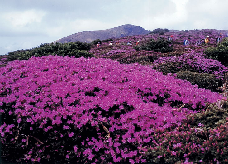 久住山群中部にある扇ヶ鼻の山頂一帯は開花のころはミヤマキリシマの群生で山がピンク色に染まる。