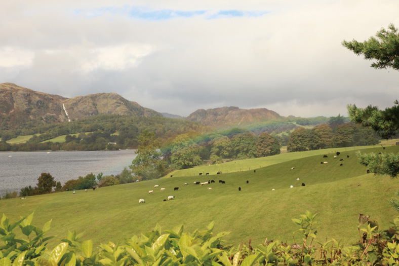 2012年9月イギリスのエディンバラで開かれた世界熱傷学会に参加し帰りに寄った湖水地方の風景です。産業革命による自然破壊を防ぐために「ナショナル・トラスト」が始まったので,今でも自然が守られています。牧草地には多数の羊が放たれていました。真ん中に「虹」が写っています。