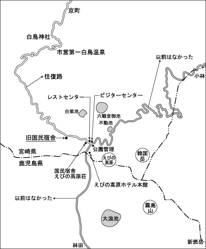 昭和26年12月約60年前,その頃はまだえびの高原の名は全く知られていなかった。ただ旅行案内書に小さく耳慣れない「国民宿舎」という記事を見掛けた私はつい思い立って,えびのに出掛けることにした。えびのに行くには昭和33年頃に林田からと小林からの立派な自動車道が開通するまでは京町からの小さな原生林そのままの山道だけだった。今から考えるとどうしてこんな山奥に行こうという気になったのだろうかと不思議に思う。