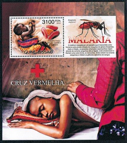 切手に病気の子どもと赤血球を描く。タブにはハマダラ蚊。シート地に休む子どもが描かれている。