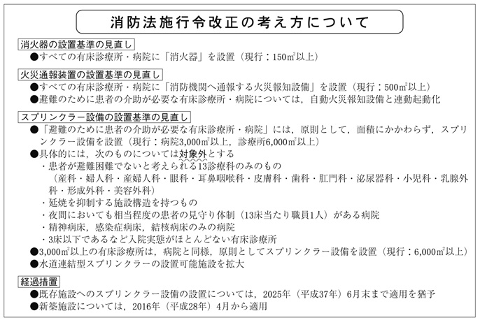 総務省消防庁は,本火災の教訓を踏まえ,有床診療所・病院等の火災被害の拡大防止対策および火災予防行政の実効性向上等に関する検討を行うために,同年10月18日,庁内に学識経験者や病院関係者等による「有床診療所火災対策検討部会」を設置,6回の検討を経て,本年6月19日に「有床診療所・病院火災対策報告書(案)」が提示され同検討部会で了承された。これを受けて総務省消防庁は,新基準について閣議決定を行い,今年8月に消防法施行令の一部を改正する予定である(改正の考え方は,次頁の表参照)。