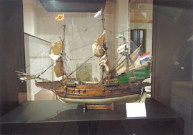 1600年,オランダ船リーフデ号が台風に遭い豊後(大分)に漂着した。5年後乗組員を本国に送還する船を平戸の松浦氏が準備したのが縁で,1609年,平戸にオランダ船が来航し,オランダ商館を開設した。1641年鎖国令により閉鎖し,長崎の出島に移転するまで貿易が盛んに行われた。1979年,当時の石造りの倉庫を模して再建され,平戸オランダ商館としてオープンした。展示品はリーフデ号の模型(写真2)や帆船を描いた絵画などが多かったが,オランダ甲冑と並べて日本の鎧・兜をオランダ風に改造した珍しい物や,日本を明記した大きな地球儀,分厚い医学書,金属製のインク壷から商船に備えた小型の大砲まであった。オランダ人は身体が大柄なので有名だが,愛想のいいオランダ女性職員が一人いて記念写真を撮ったりした。