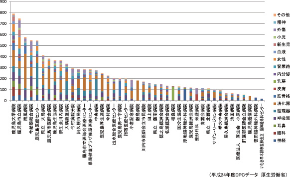 鹿児島県は国内でも高齢化の進んだ地域の一つです。鹿児島県の急性期医療の概要を知る上で,参考になるデータの一つとして厚生労働省が公表するDPC(診断群分類包括評価)対象病院の診療データがあります。DPCの場合,18の主要診断群に分類されたデータが提出されるため,どの病院でどのような診療が行われているか明らかになります。図1は平成24年度における退院患者調査に基づき,県内DPC対象病院の1カ月あたりの退院件数と各病院でどのような患者を対象としているかをグラフ化したものです。鹿児島医療センターと他の医療機関を比較してみると,DPC対象病院の中では循環器疾患が最も多く,神経(脳卒中),耳鼻咽喉科疾患,血液疾患などが多いことがわかります。またそれぞれの病院の診断群別件数を見ると,一部重なりはみられるものの,各病院の診療の特徴(機能分化と言うこともできます)がみられます。