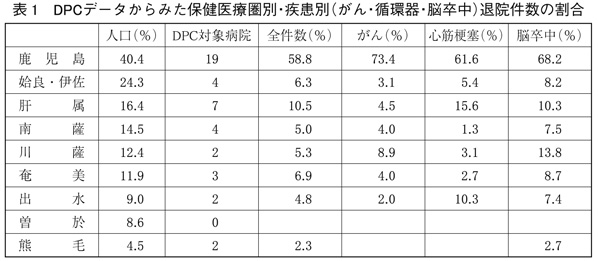 表1に示すようにDPC対象病院の退院件数の58%を,鹿児島保健医療圏で占めています。がん,心筋梗塞,脳卒中の3疾患についてみると,救急対応を要する心筋梗塞の場合,退院件数の約60%を鹿児島保健医療圏のDPC対象病院が占めるものの,肝属保健医療圏や出水保健医療圏のDPC対象病院も10%以上の件数を占めています。一方,治療開始まで比較的余裕のあるがんの場合,73%を鹿児島保健医療圏のDPC対象病院で占めており,他の保健医療圏のDPC対象病院の占める割合は,10%未満です。脳卒中はこの中間くらいとなっています。DPC対象病院の多くが鹿児島保健医療圏に集中していること,曽於保健医療圏にはDPC対象病院がないことなど,このデータが鹿児島県の急性期医療全体を反映しているとは言えませんが,県内の急性期医療の対象患者のかなりの部分が,鹿児島医療圏の病院に集中していることを示しているデータと思います。また図2に示しますように,高齢化が進んでいる鹿児島県全体に比べ,鹿児島市では今後高齢化の問題が顕著となってくることが予想されます。鹿児島保健医療圏以外の保健医療圏では患者数は徐々に減少していくのに対して,鹿児島保健医療圏では,高齢化の進行とともに循環器,脳卒中,がんの患者さんの増加に加え,高齢化に伴う呼吸器疾患(誤嚥性肺炎),整形疾患(転倒・転落による骨折など),認知症の患者さんの増加も予想されます。NHKスペシャルの中で取り上げられたことが,鹿児島でも同じ問題となってきます。国の医療政策も大きな転換期を迎えようとしています。県民への周知,医療連携のみでなく介護を含めた地域連携など,鹿児島県全体で取り組んでいかねばならない時期にきていると思います。
