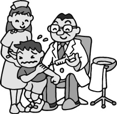 順番に並んで待っていますが、注射嫌いの子どもは不安でいっぱいです。自分の番になり、我慢も限界がきてとうとう泣き出してしまいました。泣き虫と知られたことが一番悔しいでしょうが、待つ身のリアルさがよく出ています。