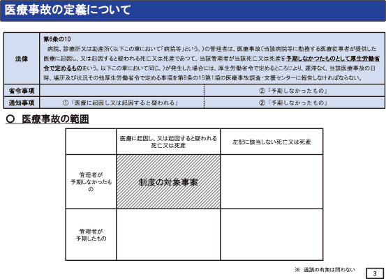 「予期しなかった死亡」としては,省令上,3項目が提示され,そのいずれにも該当しないと管理者が認めたものと規定されている。「管理者が認めたもの」であることに注意が必要である。判断の3項目を簡単に記すと,(1)臨床経過等を踏まえて死亡が予期されることを事前に説明していない,(2)臨床経過等を踏まえて死亡が予期されることをカルテ等に記載していない,(3)現場医療従事者聞きとり,および医療安全委員会の意見を踏まえて,医療従事者等が予期しなかった死亡と管理者が判断した―ものである。実務上,管理者が判断するにあたっては,まず,@カルテ等への記載があるか,A事前説明がなされていたか,Bヒアリングの結果,予期していたと認められるか否かの順番で検討し,次に,その死亡が「積極的医療行為」に起因したものかどうかを判断するのが合理的であろう。