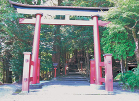 ○朱塗りの神門に入ると,参道の正面の上段に拝殿が現れます。神門を抜けてすぐ左側の社が猿田毘古社で,邇邇芸能命が降臨された際に,道案内をされた猿田毘古の神が祀られています。猿田毘古神を祀る神社は,霧島六所権現の中で霧島東神社のみです。