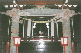 ○本殿内奥には雌雄一対の龍柱が祀られ,雄龍は爪に宝珠を握って眼光を放ち,それに対峙する雌龍は宝珠を狙うかのように龍頭を大きく差し伸べて,いかなる邪気も祓い,あたかも神座を守護するかのように立ち,拝する人をして稜威の雄心を奮い起こさせ,明日への活力を授け続けているとされています。