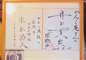 見学を終えた昼食時,近くの有名な“そば処・がんこ庵”で,10割そばを食べたらとても美味しかった。小さい店の欄間には著名人の色紙がたくさん飾ってあり,「文」役の井上真央と夫「久坂玄瑞」役の東出昌大のもあった(写真3)。店の女将にタクシーを呼んでもらって観光に出掛けた。