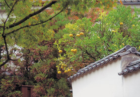 城下町は旧上級武家地と町人地に分かれ,宿泊予定の老舗旅館「北門屋敷」は前者にあった。立派な門構えをくぐって中に入ると(写真11),カラフルな花が咲き乱れる洋風ガーデンと,滝や錦鯉が遊ぶ和風の庭を備えていた。部屋数が多く通路が複雑で,しばしば迷ってしまった。3階の部屋から下を覗いたら真黄色に熟れた夏みかんの木が目についた(写真12)。明治になって貧困に苦しむ士族への救済措置として栽培が奨励され,現在では飲み物や菓子に加工されて萩の特産品となっている。最近では中身をくり抜いて羊羹を詰めたものが,テレビで“みのもんた”出演の「秘密のケンミンSHOW」で紹介されたら,製造が間に合わないほど売れているという。やっと手に入れたのを食べたら本当に美味しかった。料理も良かったし,数少ないベッドの部屋で休めて幸せな1日だった。