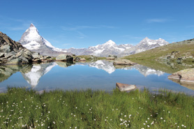 マッターホルンはヨーロッパアルプスの数多くの名峰の中で最も人気のある山で,多くのツーリストが訪れるスイスでも一番人気の観光名所です。標高4,478mのマッターホルンへの初登頂が成されたのは1865年,その際にザイルトラブルによる犠牲者が出たことは有名な逸話であり,聖なる孤高の峰として君臨しています。このアルペンリゾートの基点となる村が標高1,620mに位置するツェルマットであり,そこから1898年に開通したゴルナーグラード鉄道(歯車が用いられたアプト式登山鉄道)に乗り,ゴルナーグラード山頂近く(3,089m)まで一気に駆け上がります。展望台から眺めるヨーロッパ・アルプス第2の高峰モンテ・ローザやそこから押し出されるゴルナー氷河の姿は,圧巻という言葉しか当てはまりません(写真2)。少し山を下りリッフェリゼー湖まで行くとそこには,湖面に浮かぶ逆さマッターホルンが悠然と姿を現します(写真3)。この日は,地元のスイス人ですら経験することが少ない,透き通るような青い空であり,異次元の美しさが暫し時を忘れさせてくれました。