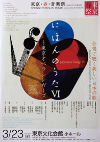 私たちは,この音楽祭のたくさんのプログラムのなかから,3月23日東京文化会館で開かれた東京オペラシンガーズの「にほんのうたY」を聴くことにした。東京オペラシンガーズは「世界的水準のコーラスを」という小澤征爾氏の要請により結成されたもので,今回は男性6人女性7人の若手声楽家で構成されていたが,この音楽祭にも毎年出演しているとのこと。会場は文化会館の小ホール。ワンフロアーでゆったりとしたスロープのある洒落たつくりで,声楽のコンサートにちょうどマッチする広さ(649席)と思われた。今年はちょうど上野公園の桜も咲き始めるその時で,まさに「春が訪れ 桜がひらいて・・・・・」を実感する演奏会であった。「合唱で聴く美しい日本の歌」15曲が演奏されたが,いずれも知っている曲ばかりで大変懐かしく,いつしか満席の人たち誰もが一緒に口ずさんでいた。「美しい情景,美しい言葉を歌い継ぐシリーズ」の6回目,美しいハーモニーに心洗われるひと時であった。
