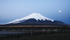 「ふみおちゃん,起きれ!起きれ!」と何度も呼ぶ声に,何事かと開かない目をこすりこすり起きると,「外に出てみれよ,早く」と言う声。ピンときてカメラを持って外に飛び出すと,まだ暗い月明かりの中に雪をかぶった富士山が煌々と浮かび上がっていた。富士山の右上には満月が輝き静かに霊峰を照らしている。我を忘れてシャッターを押し続ける・・・・。そのうち足が冷たくて痺れたようになっているのに気がつき下を見ると,浴衣の裾ははだけ,サンダルに素足の足元は凍りついた雪の上で濡れていた。