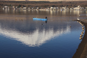 その山中湖は山梨県山中湖村にある富士五湖のひとつで,面積は最も広く標高も最も高い(全国3番目)。晴れた日は逆さ富士で有名だが,冬は湖面が凍りワカサギの穴釣りも楽しめるとのことである。