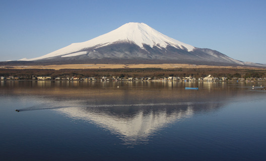 そして従兄弟の声で飛び起きると,目の前には奇跡的な情景が広がっていたのである。寒さも忘れて写真を撮り続ける。もっといい場所はないかとサンダルに素足で走り回る。少し高台にある露天風呂に上がってみると,湖面に映る富士山が・・・・・。逆さ富士である。初めて見る感動の瞬間であった。刻々と変わっていく表情をカメラに収め続ける。湖面には富士山を揺らしながら白鳥や鴨などが泳ぎ,ワカサギ漁の準備なのか青い小船が浮かんでいる。