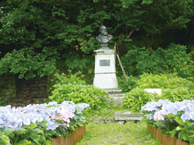 長崎には,シーボルトが私塾「鳴滝塾」を開いた国指定史跡シ−ボルト宅跡があり,路面電車で新中川町電停下車徒歩7分の場所にある。そこには,彼の胸像(写真6)のほか,妻の「おたきさん」にちなんだ「オタクサ」の名でヨーロッパに広めた紫陽花やシーボルトの木などが植えられていた。