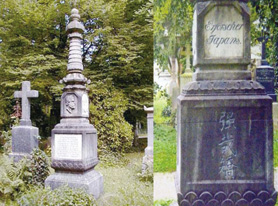 その折りに,偶然,ペッテンコーフェルの墓の近くの三十三区十三列5号に,背丈大の立派なシーボルトの墓碑を見つけた。墓碑の正面上方には彼の顔のレリーフが,下方には略歴が刻まれ,裏面の上方には「Erforscher Japans」,下方には漢字で「強哉矯」と刻まれていた(写真9)。