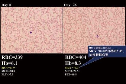 図2 左(Day 0):初診時の末梢血液像です。赤血球形態は小球性低色素性が明らか。
