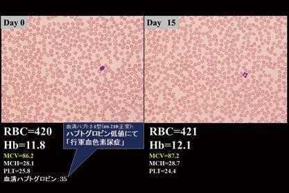 検査結果:RBC:420,Hb:11.8,MCV:86.2,MCH:28.1,PLT:25.8,血清鉄:97,フェリチン:16.8,ビタミンB12:209,血清ハプトグロビン2-1型:35(66-218:正常)