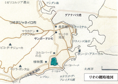 1502年1月,ポルトガル人探検家レモス達が現在のリオの市街地があるグアナバラ湾の入り口に到達したが,狭かったので河口と勘違いして「リオ・デ・ジャネイロ(1月の川)」と命名した。しかし湾内に入ったら凄く広いので川でなく海だと分かったらしい。日本からはアメリカで1回給油するが空路24時間かかり,エコノミー席だとかなりきつい。サンパウロに次ぐ大都会で人口は600万超である。かつては首都であったが今はブラジリアに譲った。