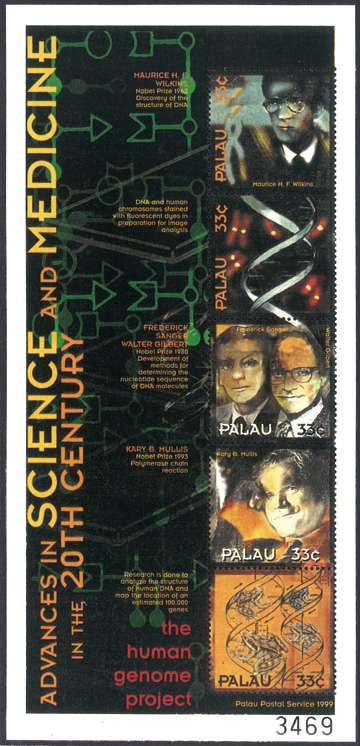 上から ウィルキンス,DNA螺旋構造,サンガーとギルバード,マリス,DNA螺旋構造