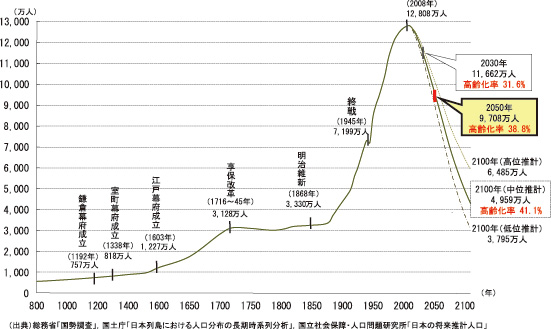 国立社会保障・人口問題研究所などによる「日本の総人口の推移と推計」(図表1)をみると,江戸幕府成立時は1227万人だったが,明治期に入ると富国強兵や産業革命などで急速に増加している。2008年にはピークの1億2808万人に達し,それ以降は減少に転じ,2030年には1億1662万人,2050年には9708万人になると推計されている。