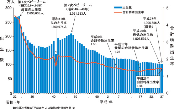 出生率の減少した理由は@核家族化による少子化A働く女性が増えたことによる晩婚化B子育ての金銭的負担増C価値観の変化−などの要因が挙げられている。政府も経済成長の隘路になっている「少子化」を克服するために「希望出生率1.8の実現」を掲げて子育て支援や社会保障の基盤強化などの取り組みを始めたが,その効果はどこまで有効なのか未知数だ。