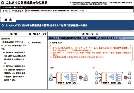 この説明としての日本医療安全調査機構の木村壯介常務理事の発言は驚愕すべきものであった。(1)オブザーバーでは,法的に資料提供ができないので正規メンバーだ。(2)省令と通知が逆転しているのは,頻繁にあることだ。小田原先生は法律違反の制度を作ったではないか,というものである。このような誤った理解でセンターの運営を行われては一大事である。この2点をもとに,医療事故調査制度そのものに立ち返って考察を行いたい。