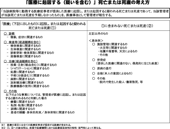 確かに,「医療に起因する(疑いを含む)」死亡または死産の考え方(「医療事故調査制度の施行に係る検討会」における取りまとめについて,平成27年3月20日別紙)(図3)の「医療」の項目に,「診察」が挙げられている。これは,診察に起因する死亡を想定してのものではない。医療法の中に,医療とは診察,検査等,治療との記載があるため,他の条文との整合性の関係上入れられたものである。そのため,上部タイトル部分に『「医療」(下記に示したもの)に起因し』と,「医療」のみに括弧書きが付いているのである。このことは,検討会の席上,大坪寛子医療安全推進室長(当時)が,明確に発言している。単なる診察に起因する死亡はあり得ないものであり,このことを考えると,現在の報告例の中にも,報告非該当例が含まれていると考えるべきであろう。多くの相談を受け付けているセンターが不適切な助言を行っている可能性がある。