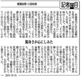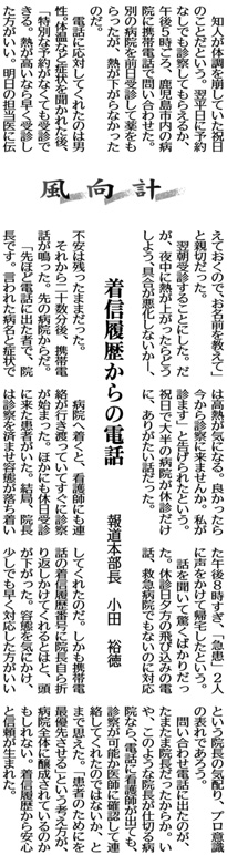 新年早々,この鹿児島市医報に拙文を寄せさせてもらうことになった。というのも,転載してある弊紙・南日本新聞の二つの記事(コラム)を,あらためて多くの人に読んでほしいと思ったからだ。いずれも医師や病院にまつわるエピソードである。